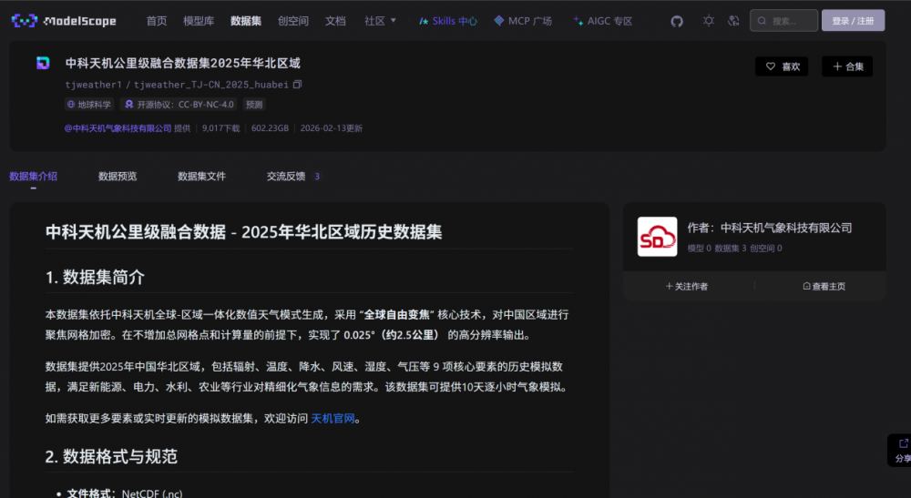 自上线魔搭社区以来,中科天机“2025年华北公里级融合数据集”凭借2.5公里超高分辨率、9项核心气象要素、逐小时连续模拟等核心优势,迅速成为高校、科研院所、AI企业及行业开发者的优选数据资源,累计下载量破万,应用场景覆盖气象预报、新能源评估、电力调度、农业气象、水利安全等领域,有效填补国内商业气象高精度数据供给短板。魔搭社区作为国内领先的AI开源社区,服务全球超2000万用户,其科学智能专区已成为AI驱动地球科学科研范式创新的重要平台。中科天机数据的广泛应用,标志着高质量气象数据已成为科学智能发展的关键基础设施,充分印证了开放共享模式对跨学科融合创新的强大赋能作用。
